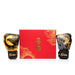 The gloves are designed with a special "Feng Shui" theme, representing the harmony of the moon and the sun, the balance of black and gold colors, and the phoenix and dragon, as envisioned by a Thai designer. They feature intricate hand-applied detailing in the silkscreen design. The Harmony Six Boxing Gloves are beautifully crafted with a unique design, and are made with genuine leather and triple-layered foam padding, making them ideal for real training as well.